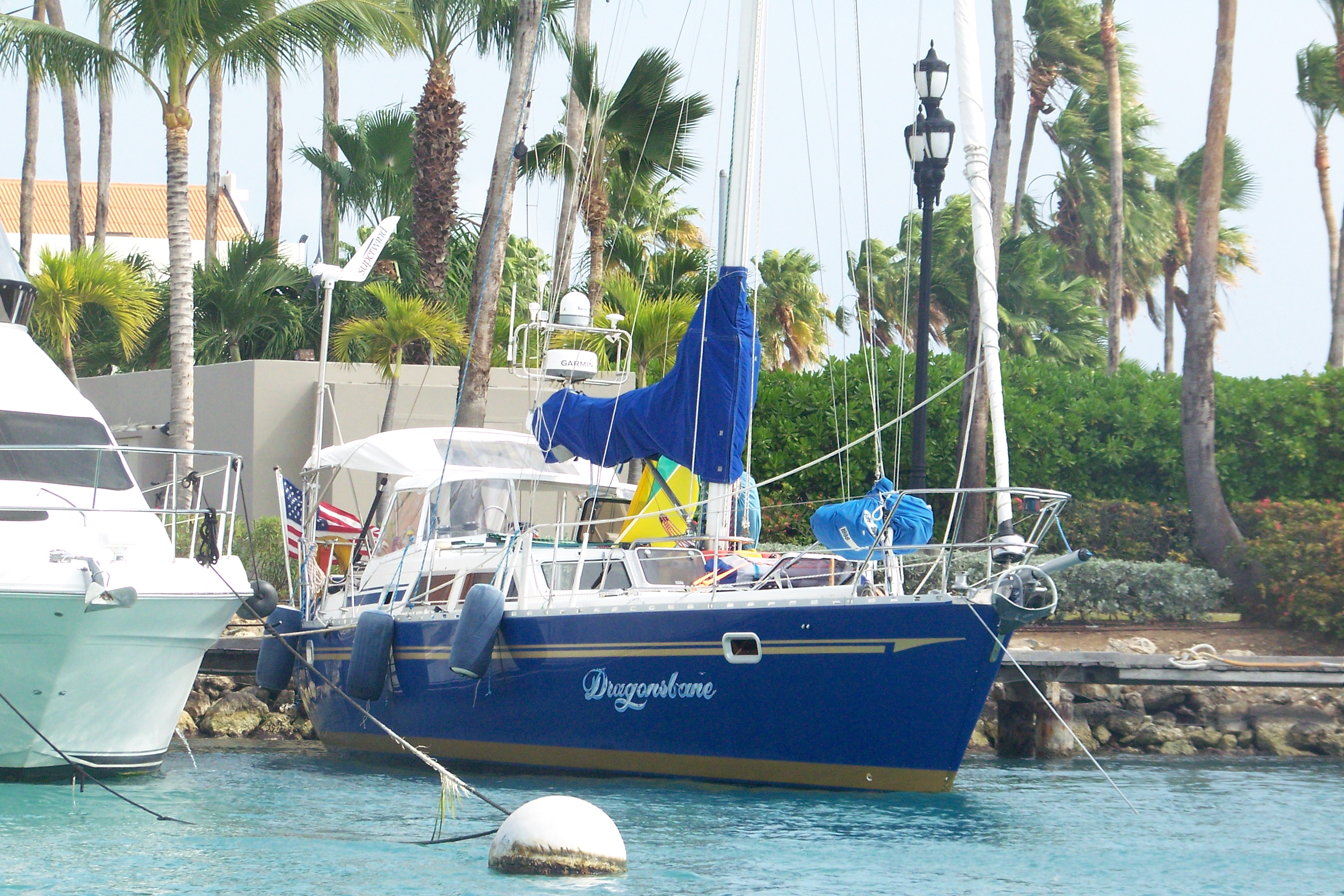 We made our passage last night from Curacao to Aruba Island, 75 nautical miles so we would arrive this morning. We left at 4:30pm yesterday and as we made it out into the ocean as the night sky filled the air we found ourselves navigating through a crowd of sleeping giants. There was at least 15 to 20 oil tankers/freighters off the cost of Curacao drifting in the wind waiting there turn to off load or fill up with oil products. I spent the first few hours playing my favorite video game! I turned on the radar and was able to see how far away and where each one of the freighters where on the radar screen, because at night on the ocean you have no depth perception. Each one of the freighters looks like it will run you over at any second but they can be anywhere from 100 feet to 10 miles away, regardless it was fun for me to sail through all the dots on the radar screen. As we made our way the wind blew up to 30 mph and we averaged 7.5 knots which was much faster then I planned on. We arrived off the coast of Aruba at 3:30am and put Dragonsbane into irons or you could say we just stalled out the boat into the wind, drifted 1 to 2 knots until we could make landfall at 8am. As we drifted for 3 hours we ended up back into a new group of freighters off the coast of Aruba, but this time it was daylight and we navigated through them with no problem. We cleared into customs, immigration, and sailed to our new marina for the next few days called Renaissance Marina.