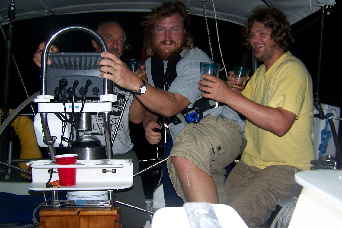 We have not seen a ship for two days now and we have not seen land for almost five days. We are very close to being halfway with 446 nautical miles to go. The sailing has been very slow, but interesting way out here in the middle of this liquid dessert. All around you can see the horizon that looks like it just falls off into nothingness. The water is a dark blue that changes from bright blue close up to almost dark black as your eyes look out into the open. Its strange not even to hear a jet flying overhead or a engine rumbling off in the distance. When everybody goes to sleep and I am on watch I can hear Dragonsbane slowly cutting its way through the ocean and the only thing that keeps me company is the compass and wind instrument as I study how the boat is moving along the 5 knot breeze. The sounds of water slapping the haul and the sails sheets being stretched as the wind fills them is the only sound left to hear. Every once in awhile I hear the faint sound of somebody below deck sounding off with a fart which makes me laugh, and I think it is to quiet out here. Then as I begin to think of friends and girls I wish I was home to say hi, but I get side track by some object flying right next to me in the cockpit. My heart speeds up and I can see just a bright green glowing light that follows me. Then it just shot straight ahead of the boat and is gone. I wonder if I am losing it, but then it is right back again and I think of hitting it with something. Then it gets so close to me and I hear a loud squawk and it is a bird, stupid bird thought you were some UFO or something. I settle back down and think of home again until something else happens.