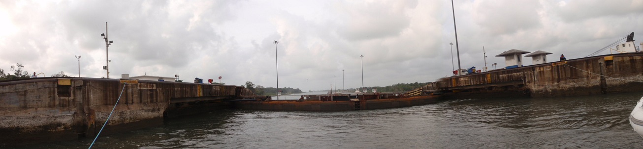After we went through the first 3 locks we spent the night on the fresh water lake and tired to a mooring ball for a freighter, enough room for two sailboats. We awoke at 6:30am and motored 5 hours to the Pacific locks on the lake. We then went through 3 more locks and dropped 150 feet to Pacific sea level.