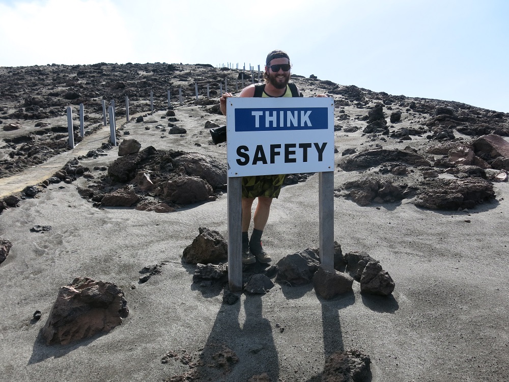 At the volcano there was no warning signs or information on what you should do or not do. When we got to the volcano path that went up the side of the mountain there was one sign and it said “Think Safety” that’s it. So looking, feeling, and experiencing the raw power of the volcano you had to wonder where it was safe to walk and how close you could get to the fire breathing dragon. We hiked slowly around the entire brim of the volcano experiencing all the different views and explosions. We felt the heat and smell of the volcano smiling the whole time. As we hiked around the brim it would get very steep to the point if you fell into the crater you would roll all the way down into the magma so we stepped very carefully. At one point in a not so good location the crater exploded sending rock 1000’s of feet up and blew my hair straight back. Cary jogged down the back side of crater and I watched from the edge with my hear t pounding out of my chest laughing at the power. Then loud streams of gas blowing out of rock faces around the magma. We spent 5 hours watching and eating our lunch with our legs hanging into the crater enjoying the day. But every time that volcano erupted my heart raced and I wondered if I should take pictures, or run for my life. I always took the pictures and Cary did to well screaming yahooooo!