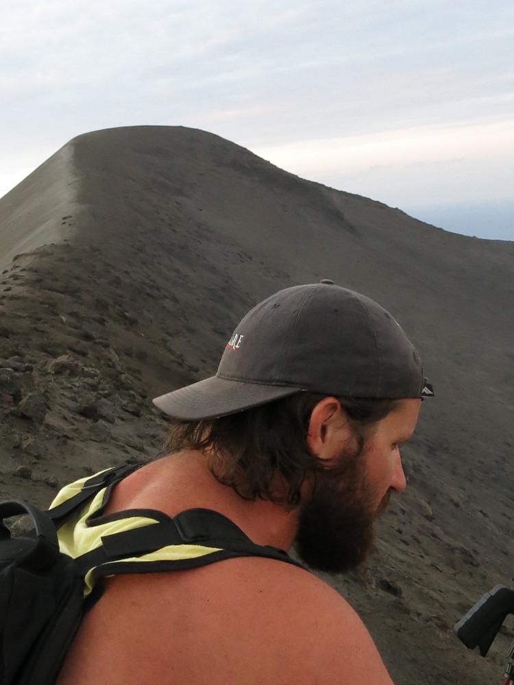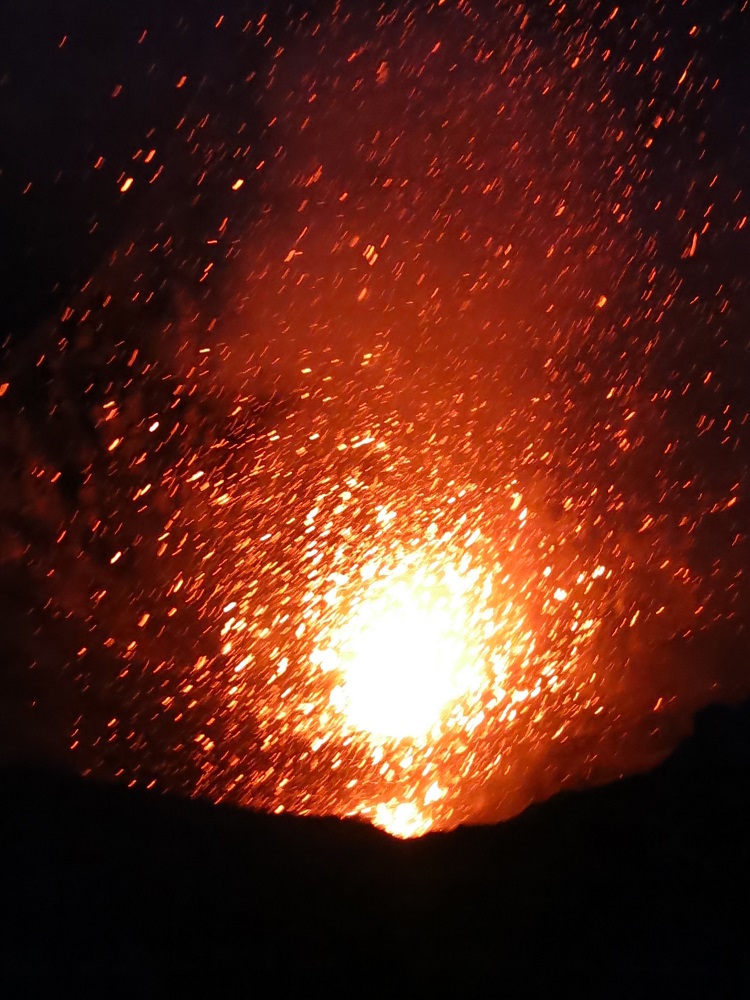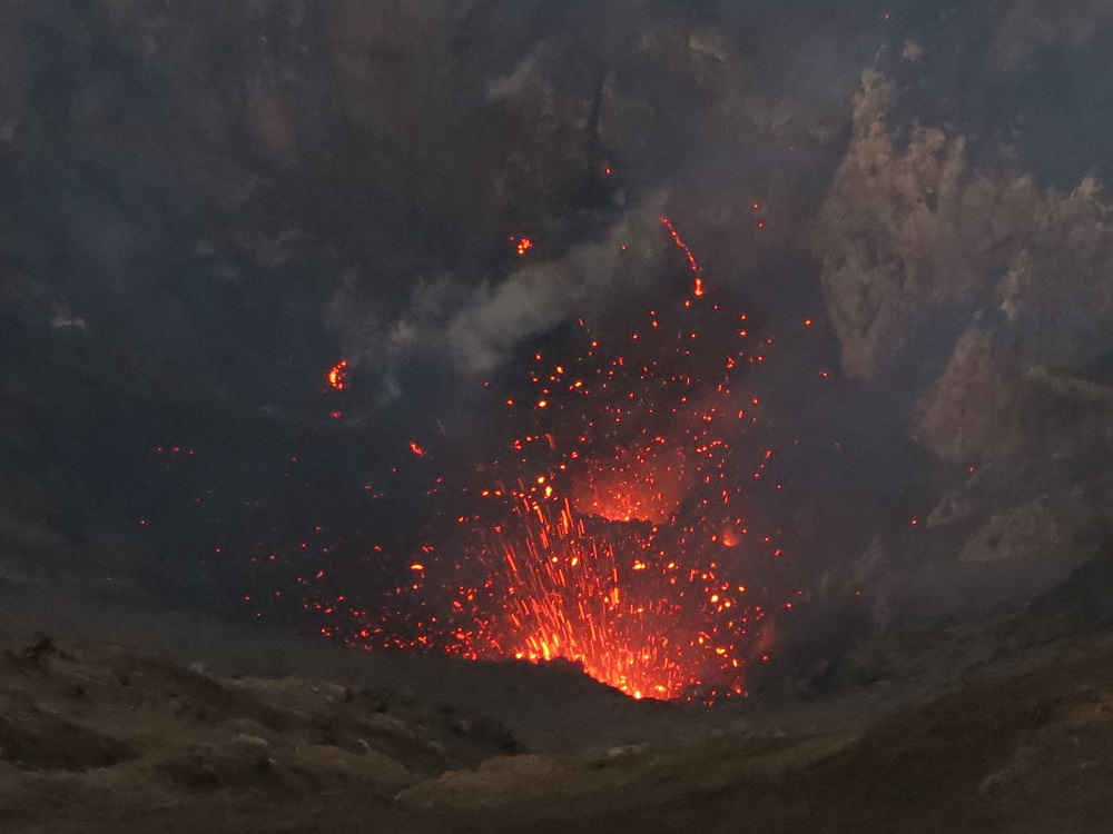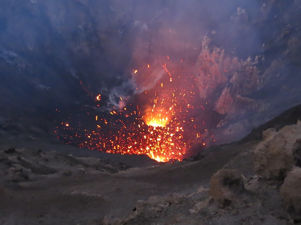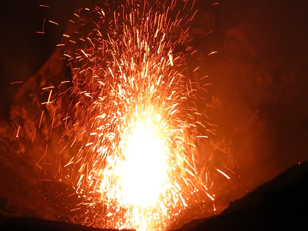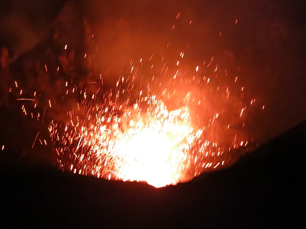 As night fell upon us the glow of the boiling mage was very bright and beautiful. The sun set and now you could see jets of fire scream out of the rocks and lava slashing up into the air. Then there would be a huge explosion and send lave 1000’s of feet up into the air and it would be like a million flashes of light bright red. Now we set up our observation point on the far side of the volcano so we could look right done into the crater. Being in this location also amplified the sound and concussion of the blast. After ever eruption we would get a shower of fine pepper rock and ash that covered us from head to toe. By the time we packed our gear up we were black with rock, sand, ash, and smelled of sulfur. With the glow and eruptions of the volcano on our left side we hiked in the darkness along the crest to the path leading off the volcano. It was the best short hike off of a mountain I ever experienced in my life. The volcano would erupt and you would jump a few feet down the ridge away from the crater and then get a ash rain that would fog your head lamp shining your path. We made it off the volcano in hour.