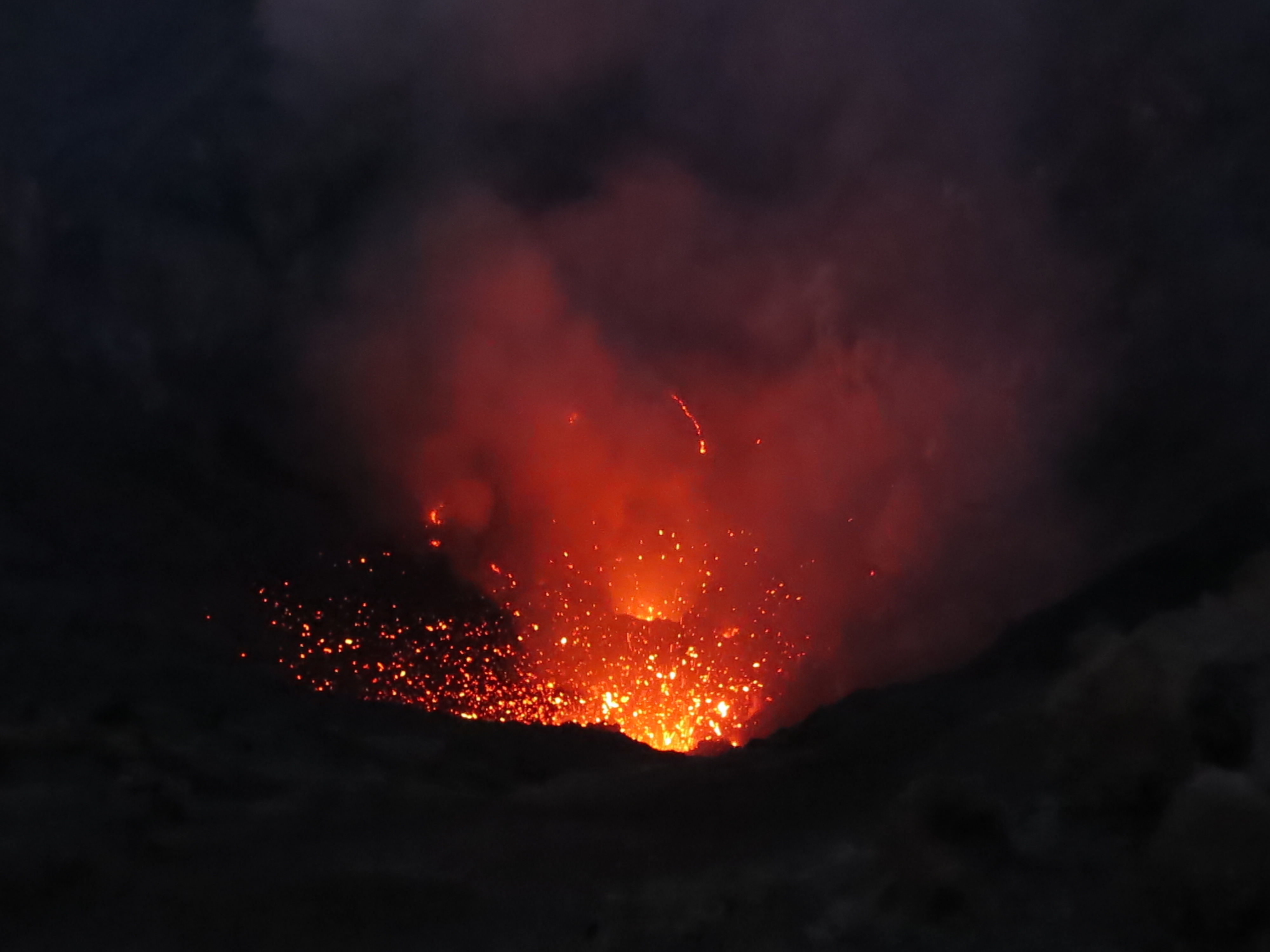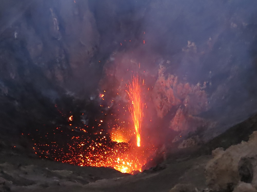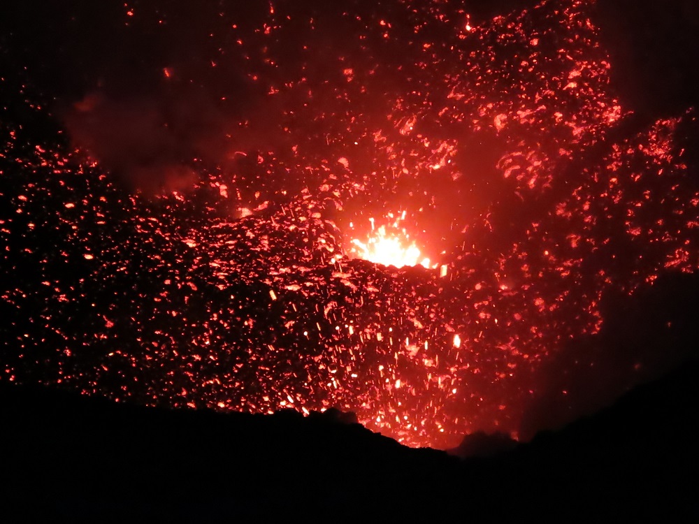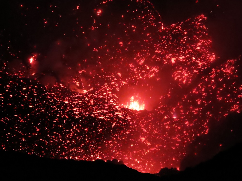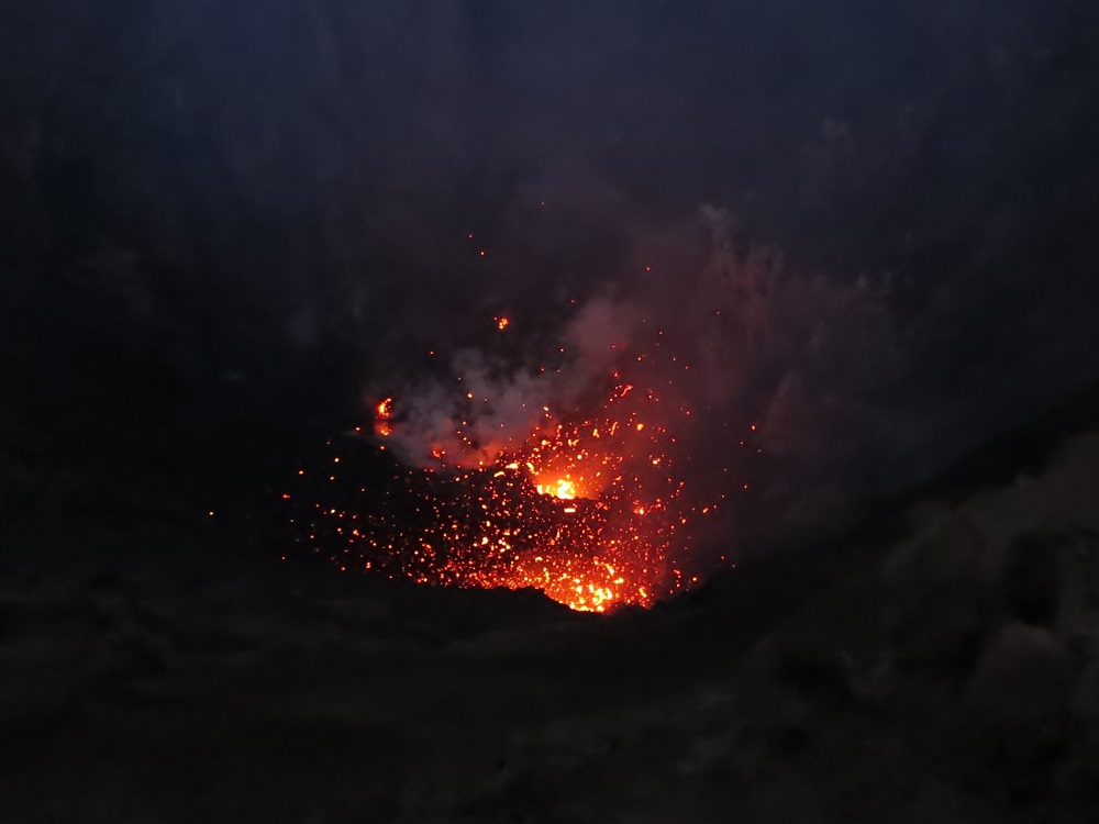 As night fell upon us the glow of the boiling mage was very bright and beautiful. The sun set and now you could see jets of fire scream out of the rocks and lava slashing up into the air. Then there would be a huge explosion and send lave 1000’s of feet up into the air and it would be like a million flashes of light bright red. Now we set up our observation point on the far side of the volcano so we could look right done into the crater. Being in this location also amplified the sound and concussion of the blast. After ever eruption we would get a shower of fine pepper rock and ash that covered us from head to toe. By the time we packed our gear up we were black with rock, sand, ash, and smelled of sulfur. With the glow and eruptions of the volcano on our left side we hiked in the darkness along the crest to the path leading off the volcano. It was the best short hike off of a mountain I ever experienced in my life. The volcano would erupt and you would jump a few feet down the ridge away from the crater and then get a ash rain that would fog your head lamp shining your path. We made it off the volcano in hour.