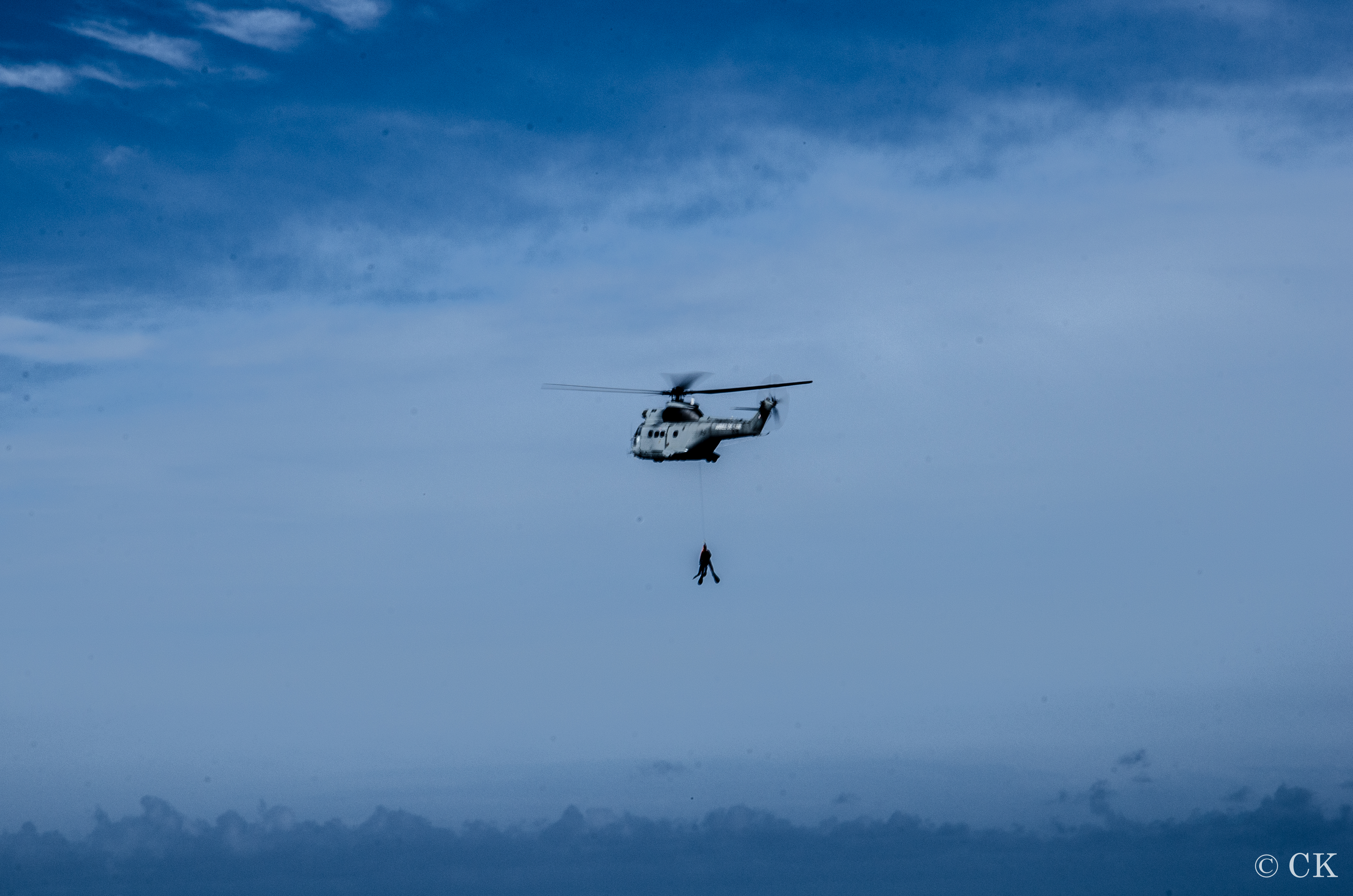 Apron our arrival at the outside reef that sits 6 nautical miles off the New Caledonia main land we approached the Petite Passé to the Port Noumea, Baie de la Moselle. As we approach so did the French Navy in a helicopter with a diver hanging for it.