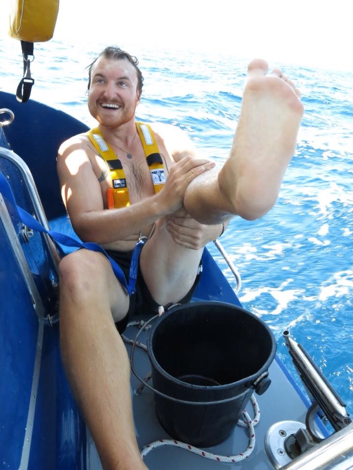 At around 22:00 Ben was trapped in the bathroom. Yes that’s right the door hardware broke and Ben was trapped until he crawled out the side door. After a half hour of work I managed to get the door open and discovered that the internal hardware was broken. I replaced it with a different door hardware but in the process the door slammed shut on my bicep pinching my skin into the door and frame causing a large blood blister that I can now add to my list of injuries. THe good news is the door hardware works now. But the fun events were not over for myself. I was awoke by Sarah because my alarm failed to work and she said that a squall was coming and I should come on watch. The squalls came and the wind would change by 30 degrees to the north then swing to 30 degrees to the south with wind speed from 8 knots to 30 knots. So far in the last 3 hours we have made 6 nautical miles of headway. Yes, I need a BEER!