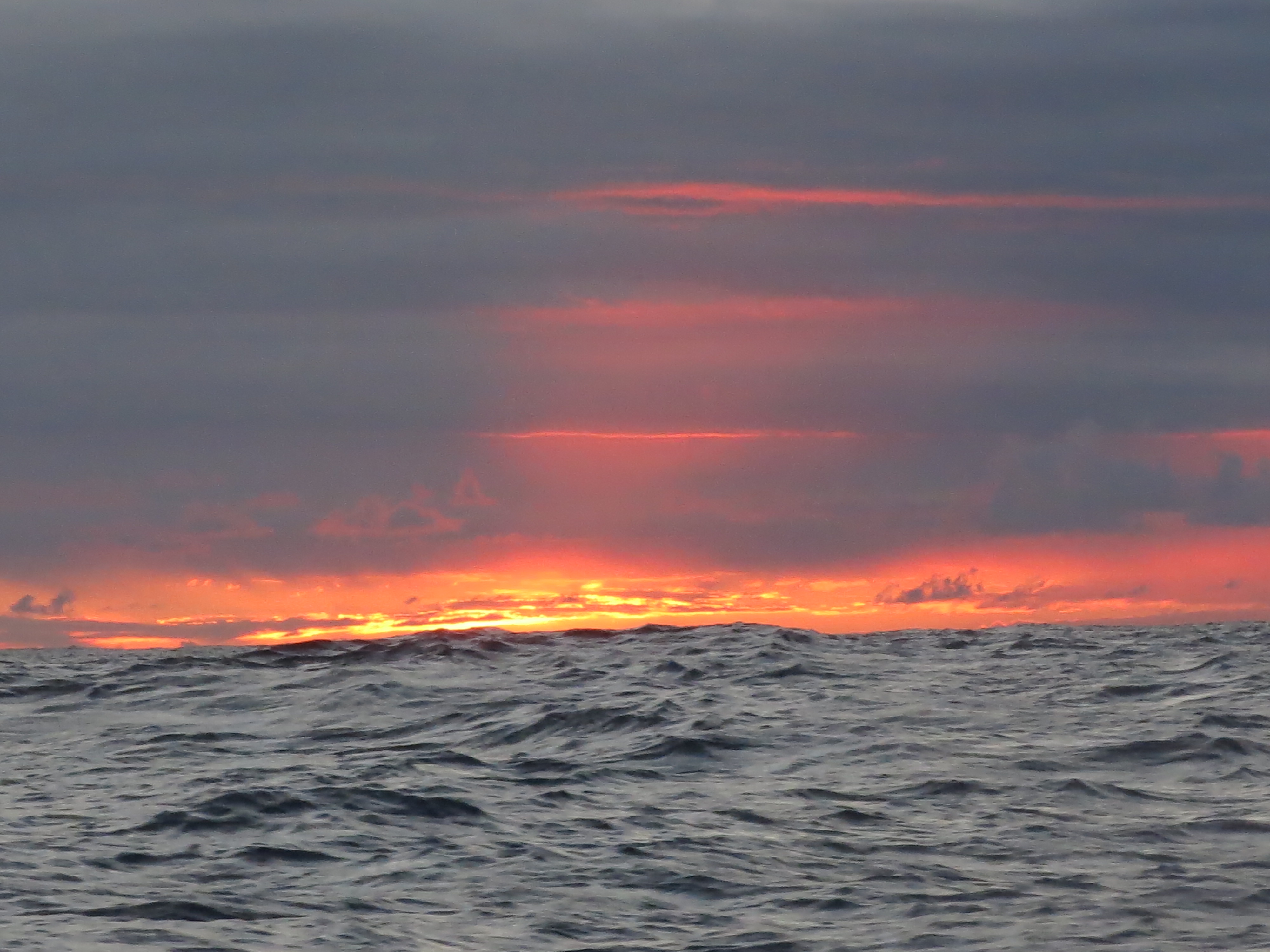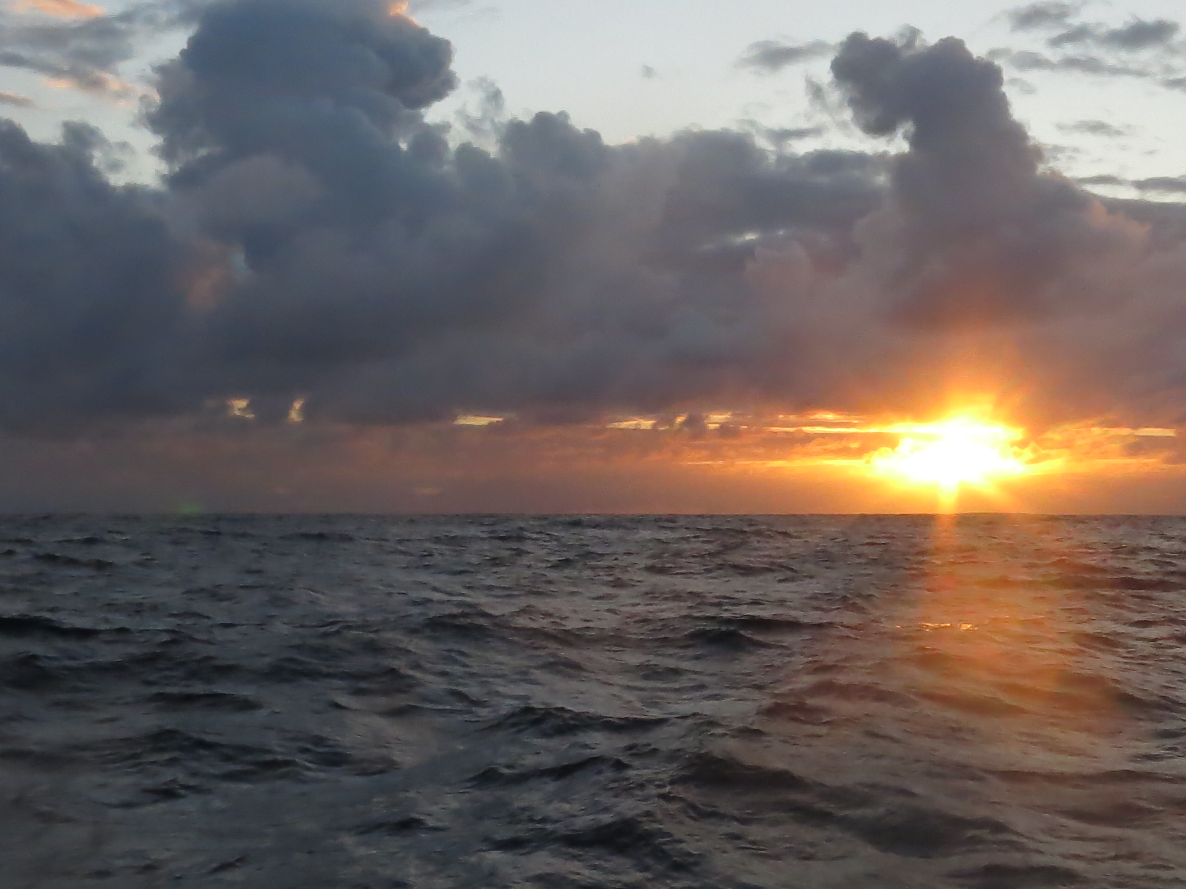 At about 22:30 at night the barometer was reading 1017MB and slowly began to fall to 1015MB. This of course occurred much slower then the 35 knot winds that blew in and 2 meter seas. The change in wind conditions and sea state only took ten minutes and was slowly reflected in the barometer over the course of 4 hours which been then we were under just a staysail make way at 6 to 8 knots. To added to our fun the current we have been traveling on from east to west changed to north to south and is pushing us down at 3 knots slowing our west progress down to 4 to 5 knots. The swells are also coming out of the north catching us on the beam and soaking the poor person on watch on a regular bases. But that’s not all folks, throughout the night we were surrounded by thunder head squalls that flashed 360 degrees around us and lit up the sky like cannon fire on the horizon incredibly ever few minutes for hours. It has been a amazing show during the night and now the wind has lesson to 18 knots but the current is still causing us to slip more south, hopefully not for to much longer. Boy I tell you, this is great fun for me at least, I think the crew is enjoying it too.