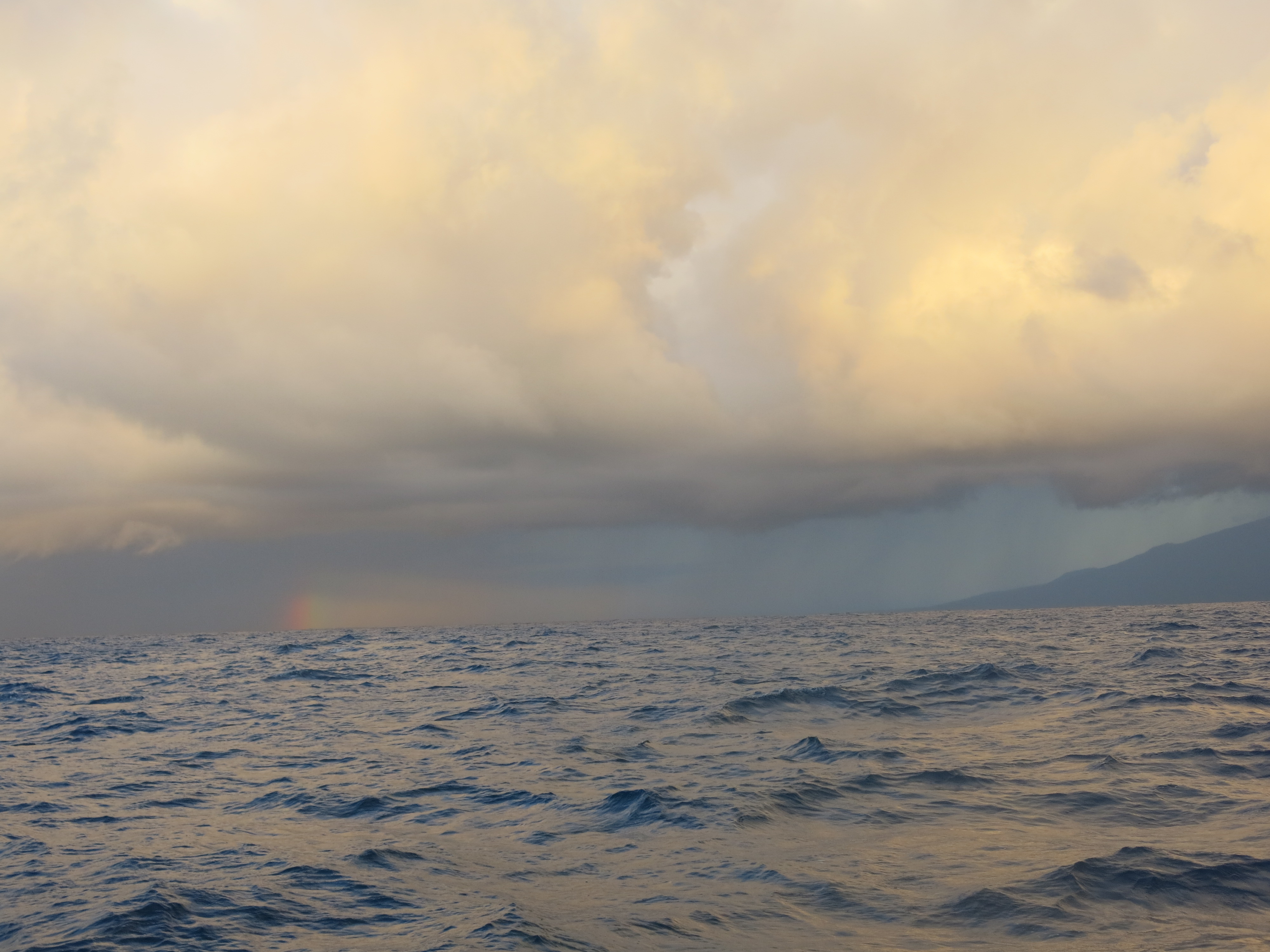 Yesterday evening at the end of my watch I could see on the horizon a large dark blue could that was low to the water. As we approach this large front I noticed a large gray iron ring projecting out from the dense areas of the approaching storm. I decided based on the movement of our past few storms that the front was moving from north to south. We were approaching from the east heading west into this system that was flashing lots of lightening and you could thunder. I decided to drop sail and reef to a triple mainsail, and hoisted our storm staysail. I then had Jade reach almost due north and slow us down to about 2 knots allowing the bulk of storm to move south so I thought. As the lightening and thunder increased and the front approached closer I decided to tack to the north east allowing us to get more north and away from the approaching storm because I thought I could see the back side of the system. Right after we tacked a rush of ice cold air like entering into a department store from out of the summer heat into AC. The wind was ice cold and then it began to blow. It reached up to 40 knots in less then a minute. Dragonsbane had her rail underwater and the waves began crashing over the deck. Then the rain came in buckets and whited out the air with cracks of thunder and bright lightening. I relieved Jade from the Helm and turn up into the wind pinching as hard as I could but still keeping us moving forward at 3 knots. The spray from the waves was blinding our sight and the wind began to spin 90 degrees to port then to Starboard making it very hard to keep Dragonsbane under control. We continued like this for 1 hour and finally the wind began to lesson down to 30 knots. But the rain, thunder and lightening lasted for 4 more hours. Eventually the wind dead off to 5 knots on the nose and we have been motoring sense. Everybody is doing well and sense we have been motoring we caught another Maha Maha weighting in at 22 pounds.